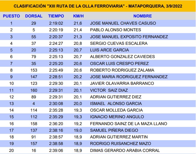 Clasificación Ruta de la Olla Ferroviaria 2022